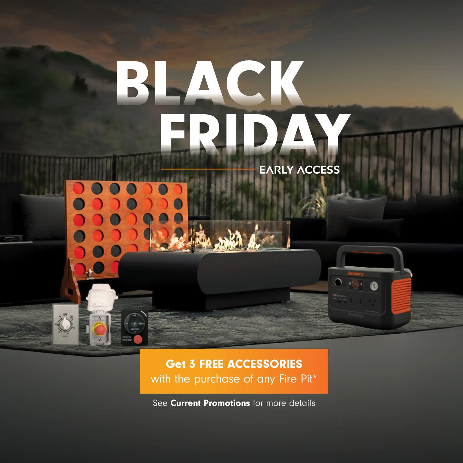 Valid with any Fire Pit type or configuration - electronic, spark ignition, wood burning, etc. Free Accessories include any combination of a: Glass Wind Guard, Canvas Cover, Gas Timer, Emergency Stop Button, Dial Timer, WIFI Adapter, Select Outdoor Games, Select Portable Solar Panel Chargers, and the Jackery Explorer 240 v2 Portable Power Station. Wind Guard and Canvas Cover will be sent out based on Fire Pit size.
