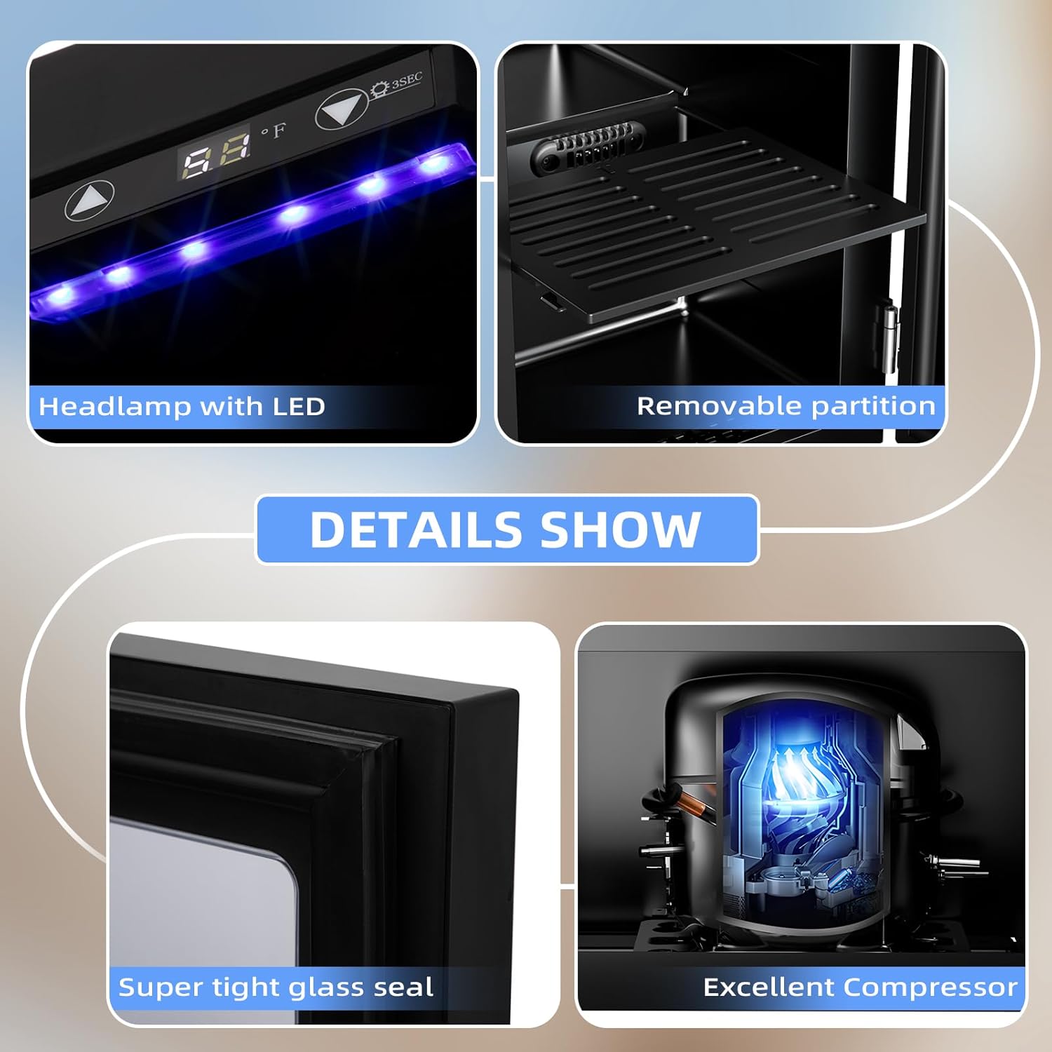 - IDEAL LIGHT and HUMIDITY: With its reinforced door with air tight seal and help to maintain an ideal humidity level, this beverage refrigerator gives you a compact and modern design better for your living room. Blue soft LED interior lighting can not only let it look smart, but easy to find your drink in dark.