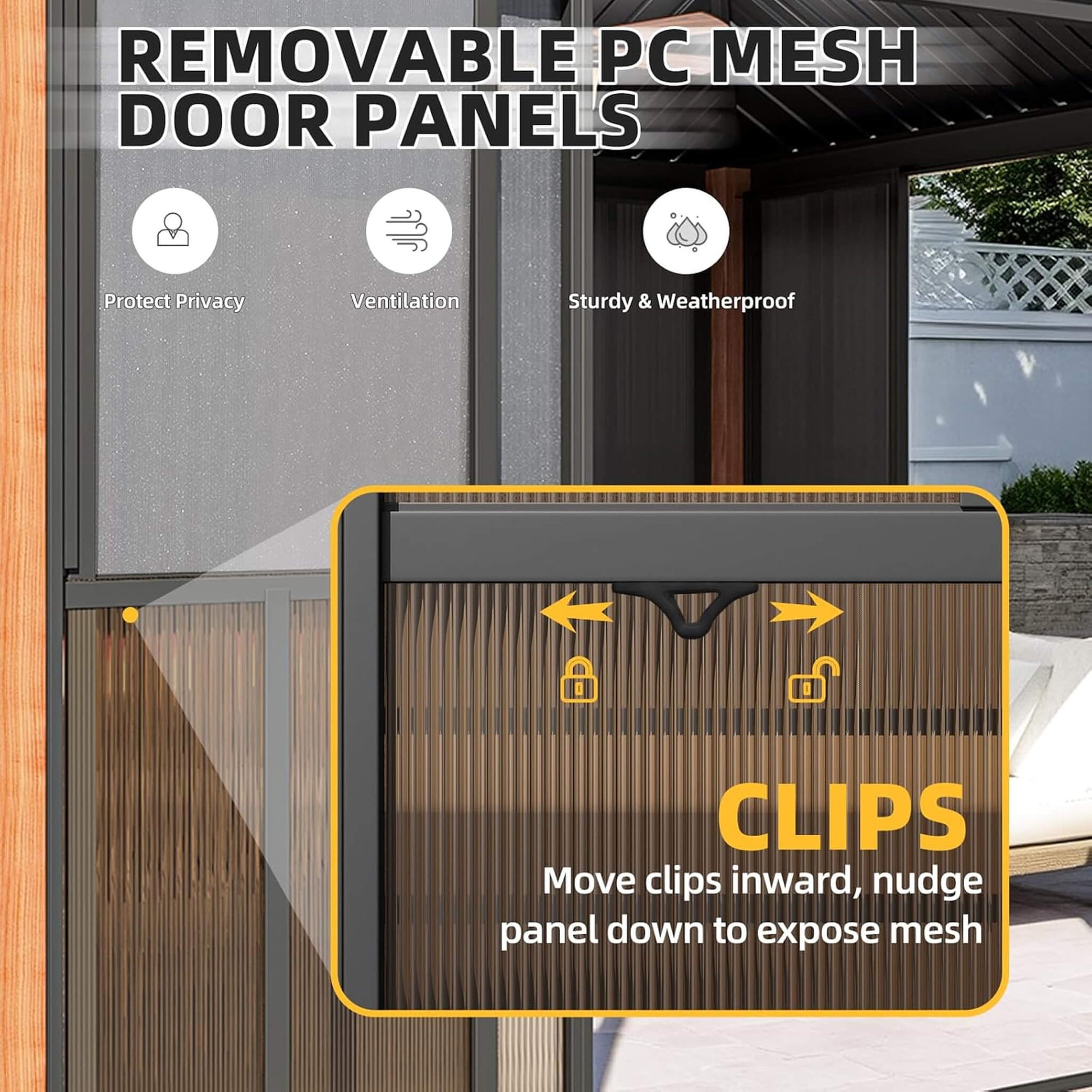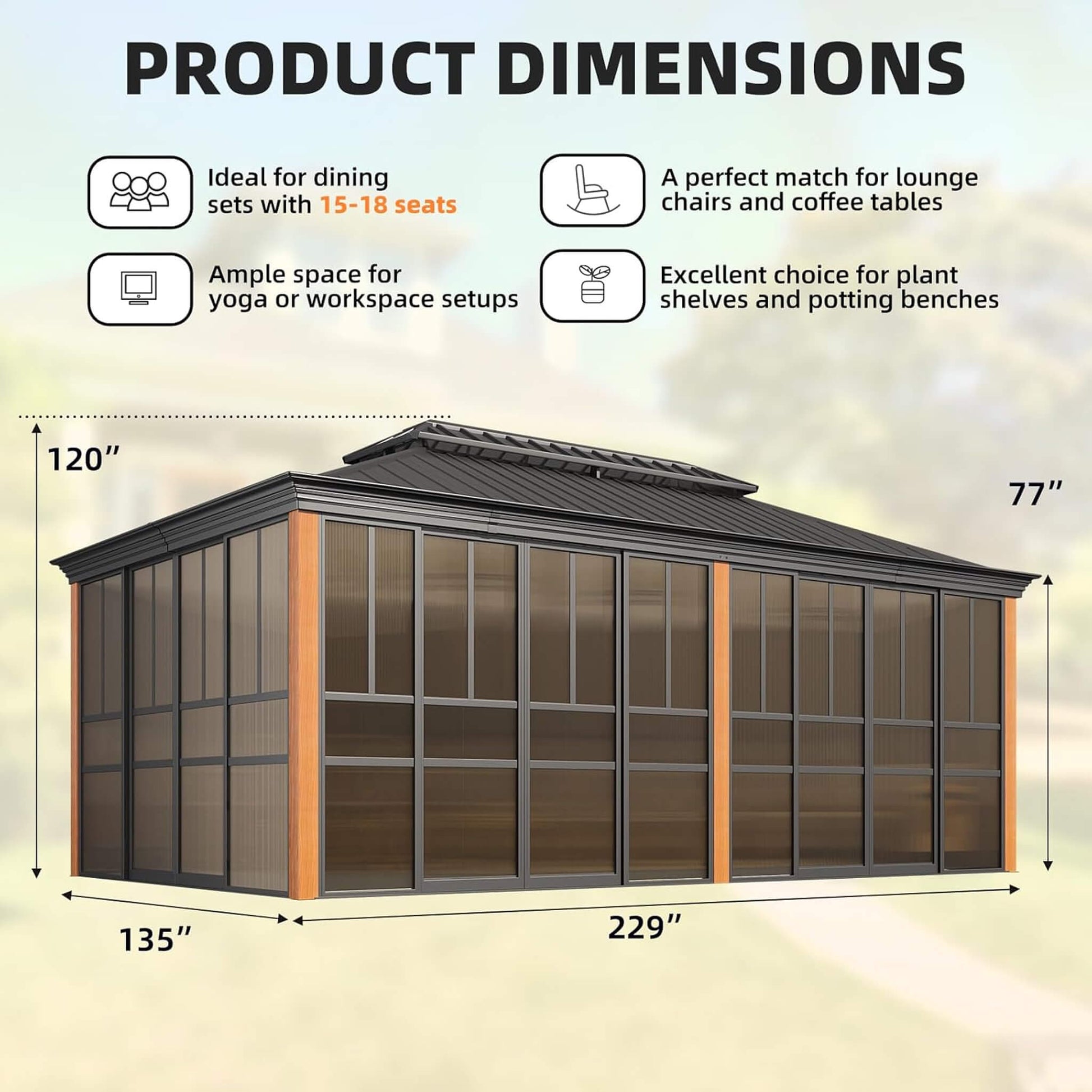 Spacious enough to accommodate your favorite outdoor furniture, this sunroom adapts to your lifestyle throughout the year. The flexible PC screen walls slide and move without requiring disassembly, allowing you to quickly adjust between full protection and open ventilation. Create an outdoor office, a relaxing retreat, or an entertainment space that delivers comfort, privacy, and unobstructed views whenever you need them most.
