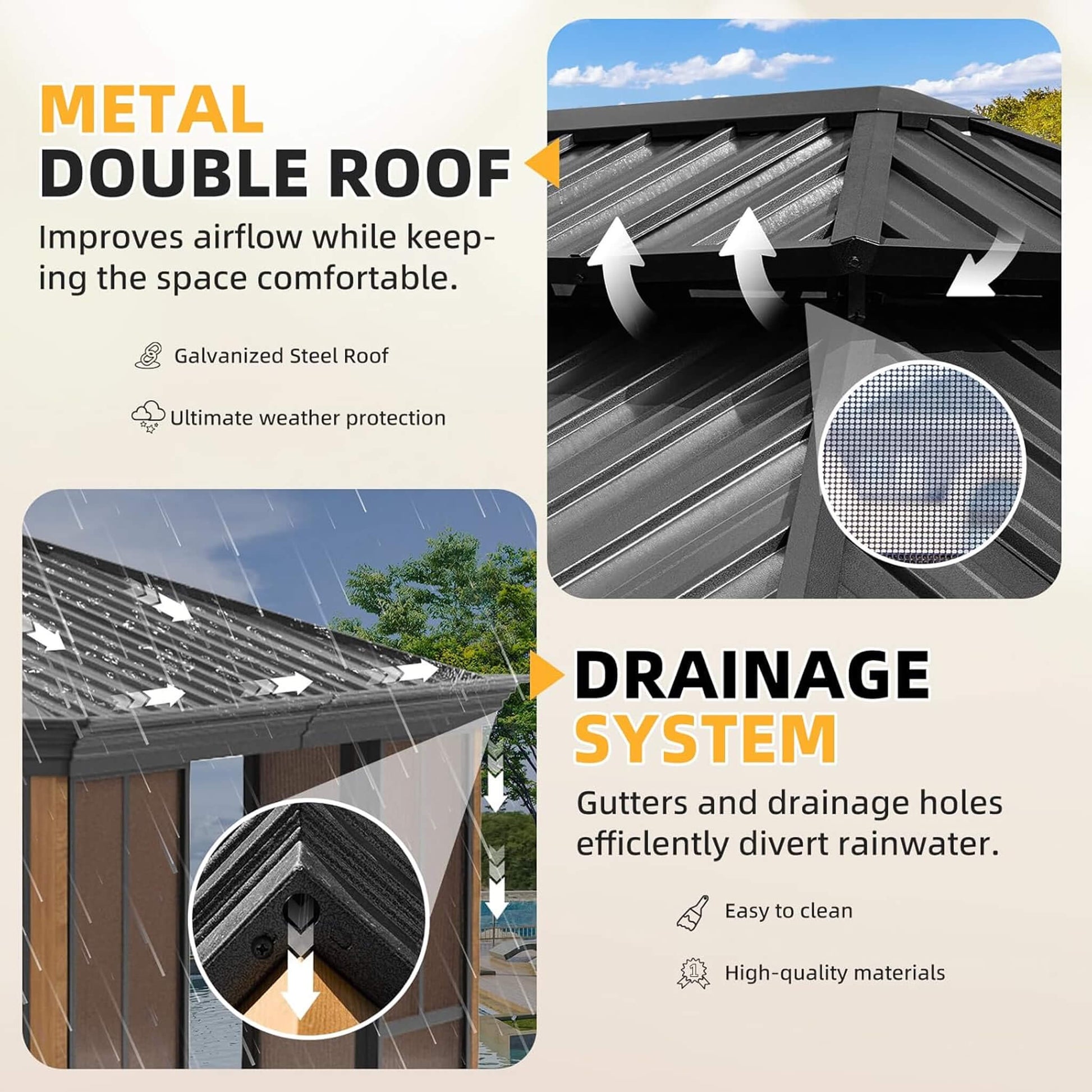 This premium all-season outdoor sunroom brings year-round comfort to your backyard with its innovative double-roof design. Constructed from galvanized steel, the dual-layer roof provides superior insulation during winter months while offering enhanced ventilation when temperatures rise. The thoughtfully engineered structure protects against falling debris while maintaining optimal climate control, ensuring your outdoor time remains comfortable regardless of the season.