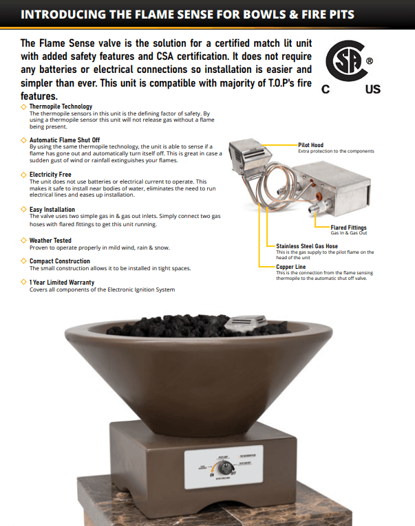 Match Lit Flame Sense selection - Bowl, Fire Pan, Burner, Whistle Free Hose, Gas Orifice, Mounting Bracket, Lava Rock, with Flame Sense System Installed on the bowl itself since the bowl is too heavy for a pedestal.
