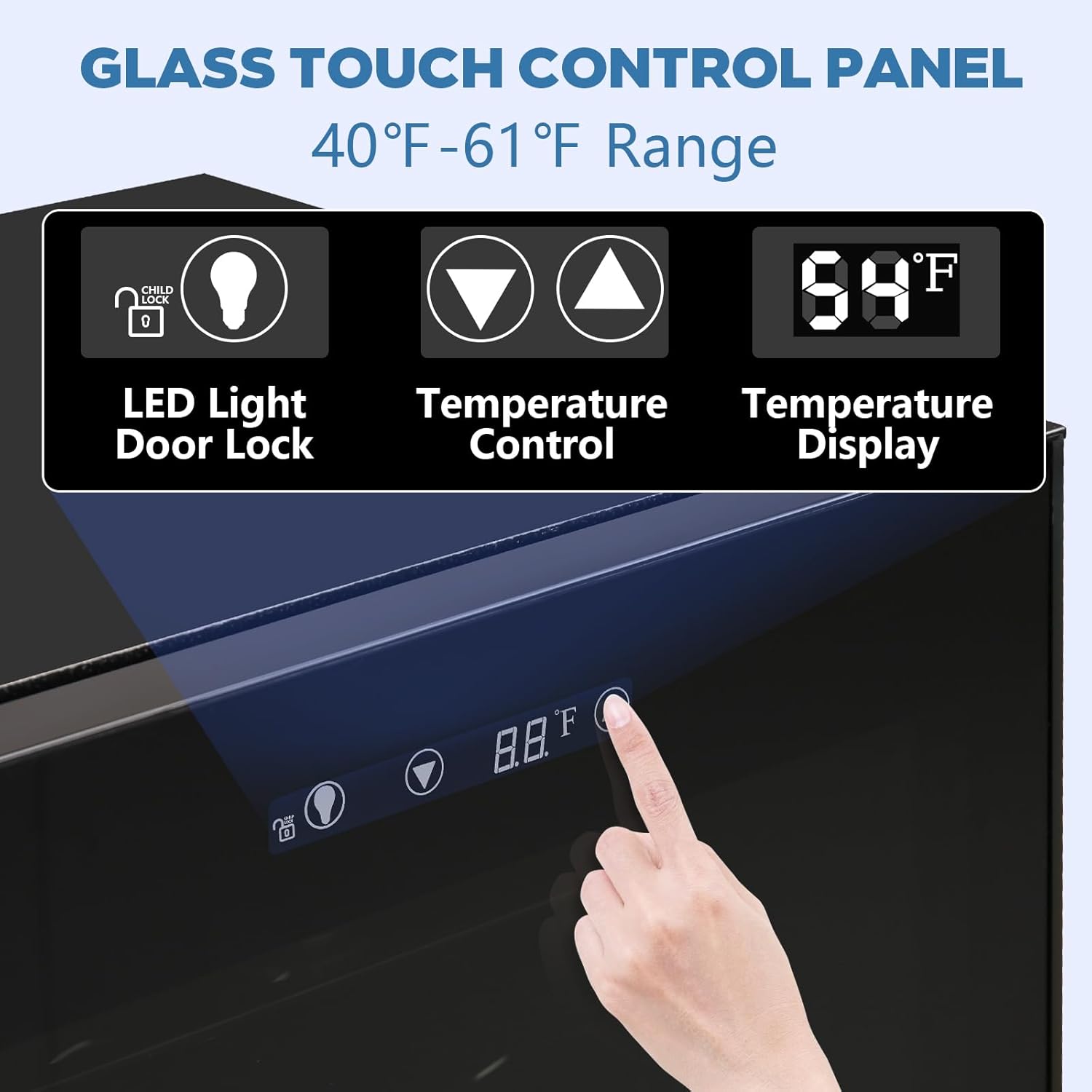 【Smart Touch & Temperature Control】This glass door beverage refrigerator of ours features an easy touch temperature control with digital temperature display ranging from 40°F to 61°F to meet your needs for storing different beverages. If you want to set it to constant temperature mode, set the temperature to your desired value and press the child lock once. If you want to change the temperature again, simply press the child lock three times to unlock it. It is a good helper for your family!