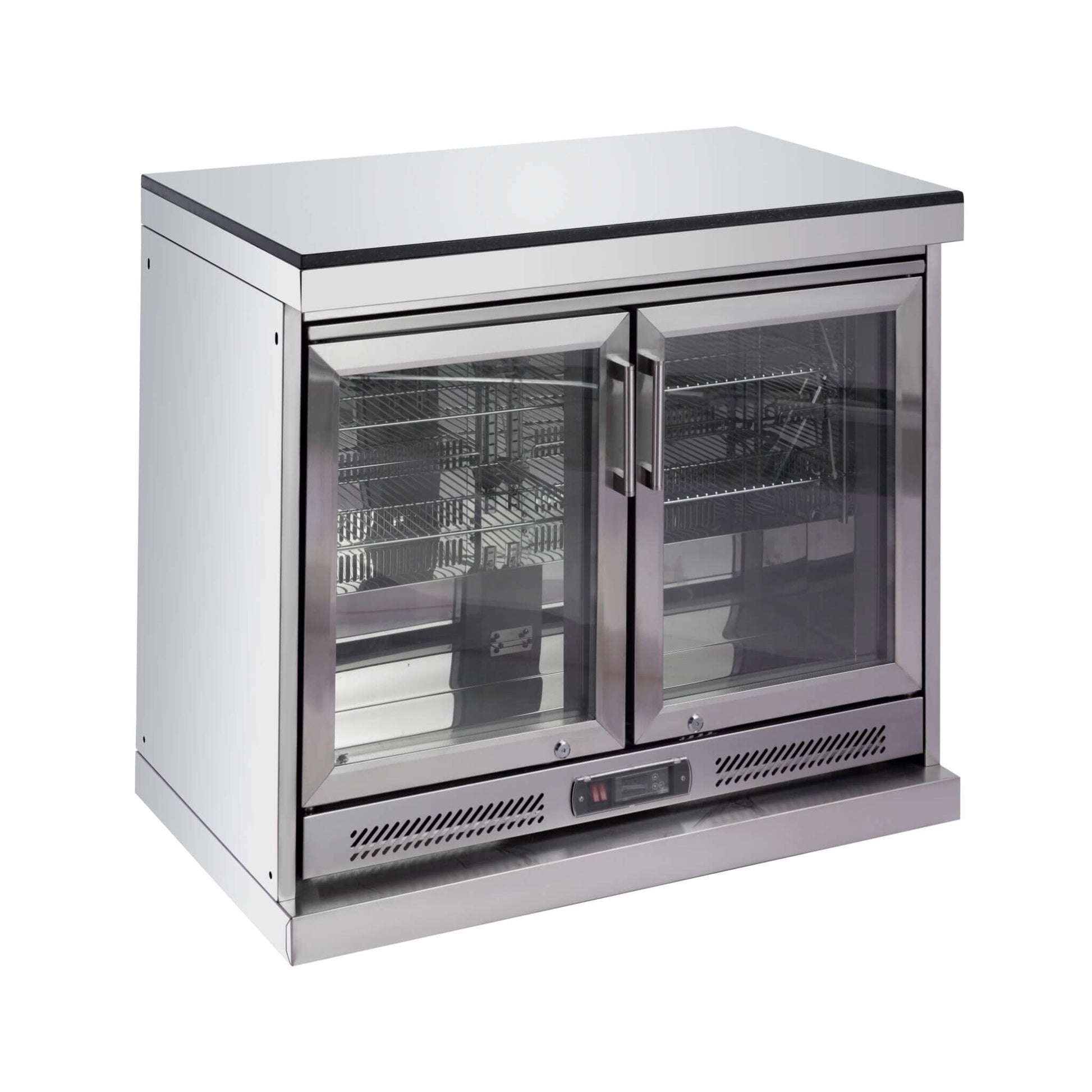 - Keep your beverages perfectly chilled and ready for guests with the included outdoor-rated refrigerator, featuring a lockable glass door for security, adjustable shelves for flexible storage, and sophisticated interior blue lighting.