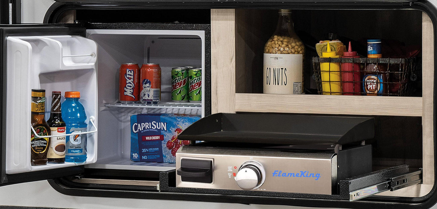 The Griddle can be mounted to your RV pull-out kitchen. Set up and put away your cooking griddle in seconds with this innovative and unique RV product. Gas Griddle connects directly to your RV propane system. Flat Teflon Coated Cast Iron Griddle ready for Griddling.