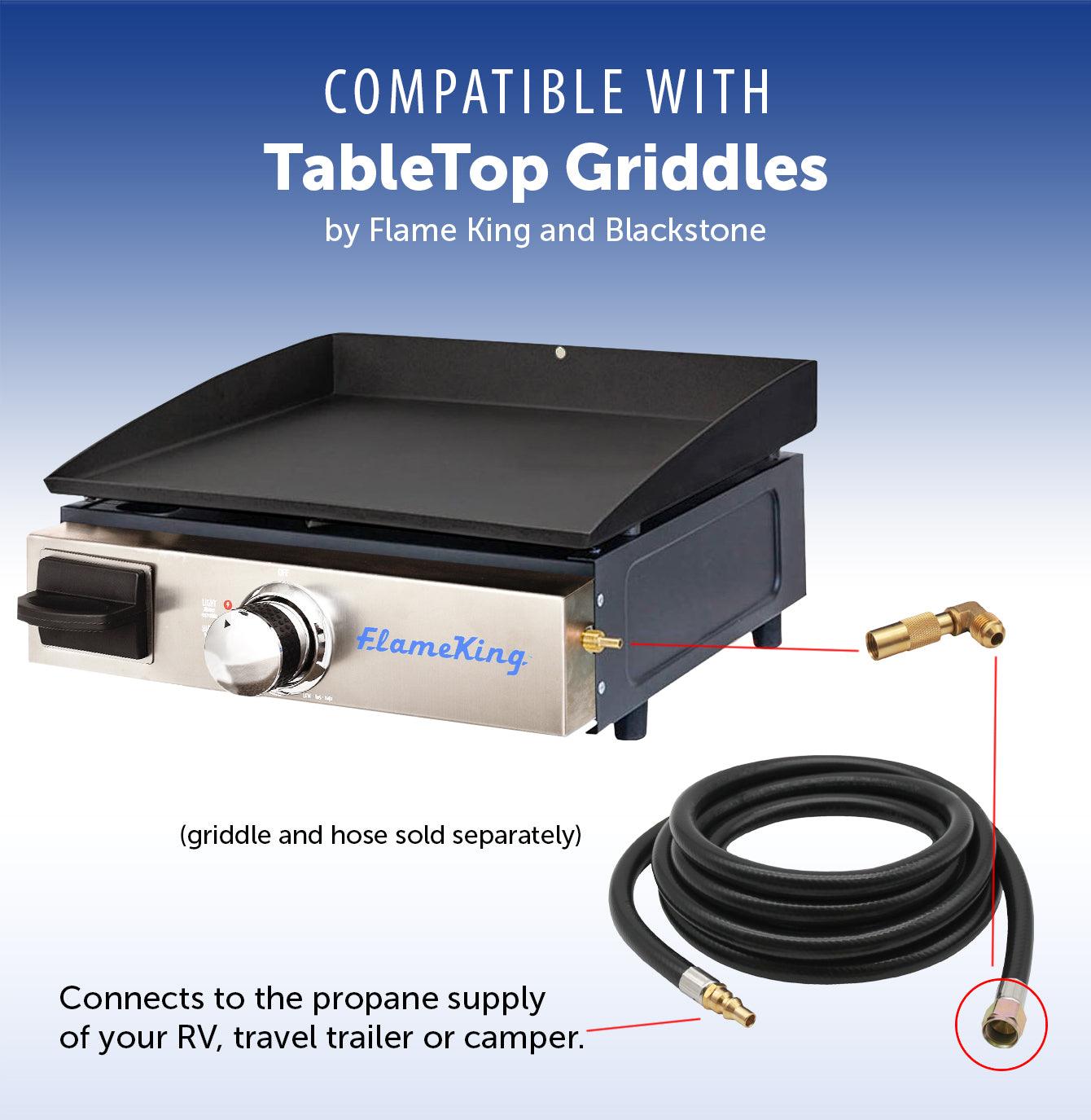 This 3/8" Male Flare Elbow is compatible with the Flame King Griddle. It converts the Flame King Griddle LPG connection to a 3/8-inch male flare, allowing conversion to the low-pressure system on a Travel Trailer or Camper. Made of 100% premium brass, the fitting provides a safe and secure connection from your grill to its propane source. This unique Elbow design allows the hose to drape over the back of the table out of the way, helps to save space, and makes it more convenient to connect your other propane appliances. This adapter also allows you to switch from a 1-pound propane bottle to a regular BBQ propane tank.