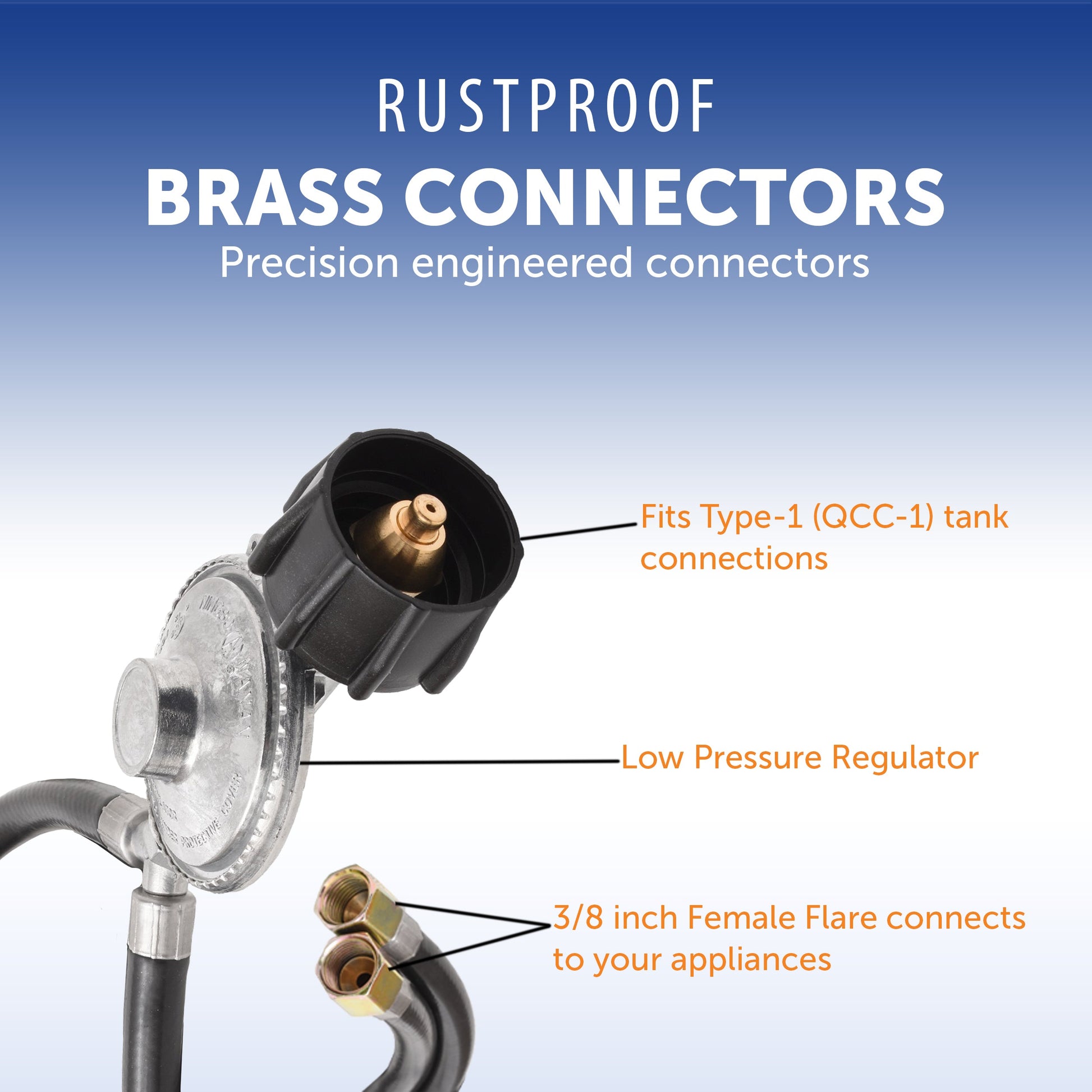 Flame King's Propane Low-Pressure Regulator Assembly for BBQ With Side Burner. Used to connect pressure regulators to BBQs smokers, torches, cookers, and other high-pressure appliances. Replacement for barbecues with side burner. Hose with regulator assembly. High-pressure rubber hose with brass ends.