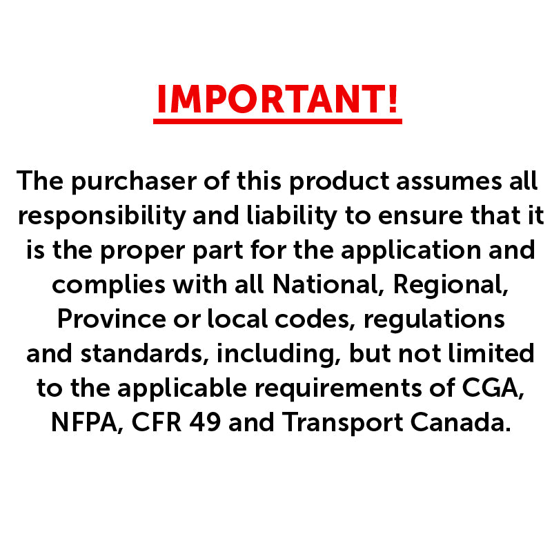 IMPORTANT: The purchaser of this product assumes all responsibility and liability to ensure that it is the proper part for the application and complies with all National, Regional, Province or local codes, regulations and standards, including, but not limited to the applicable requirements of CGA, NFPA, CFR 49 and Transport Canada.