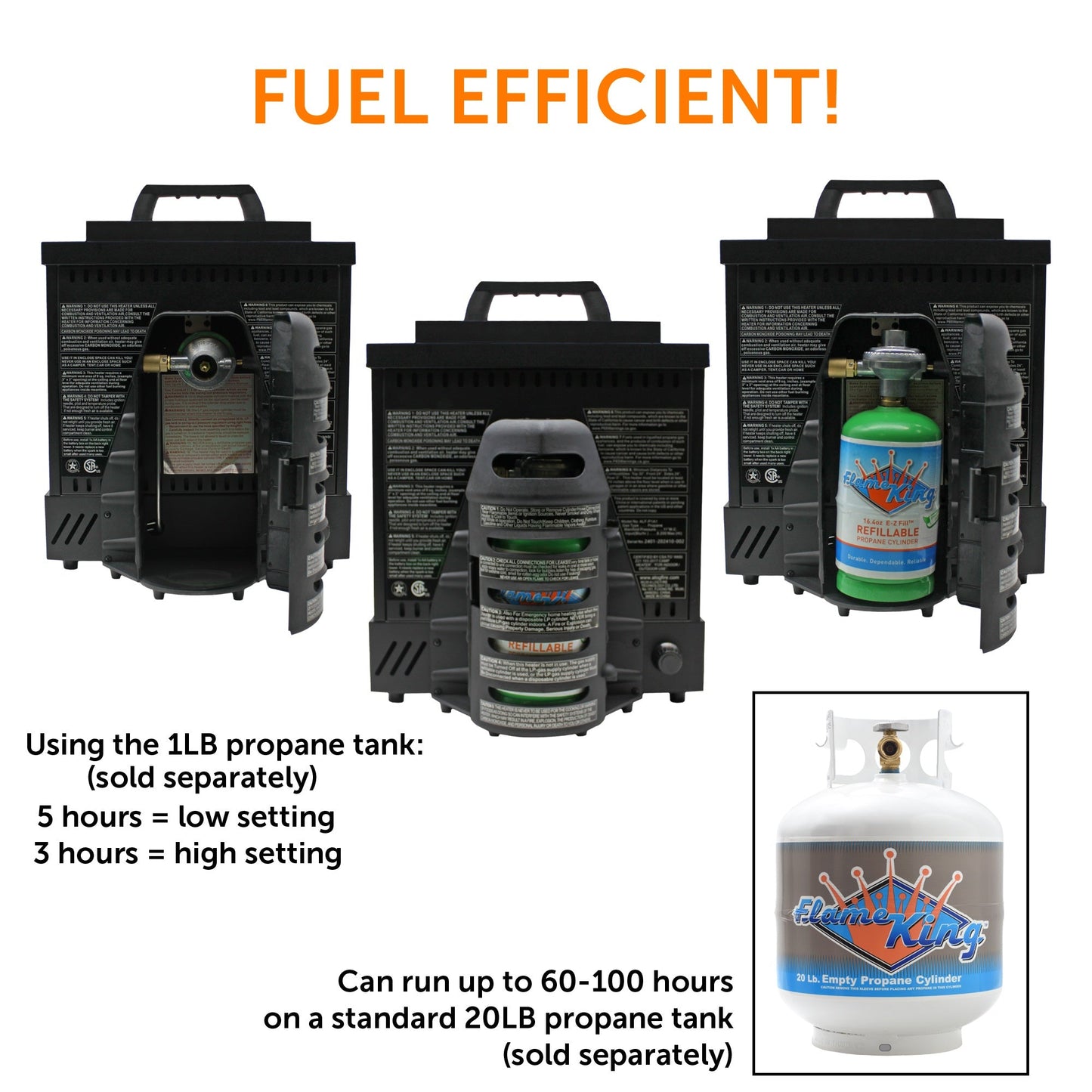 It can run up to 100 hours on the low setting and 60 hours on the high setting using a standard 20LB tank and heats up to 300 SQFT of space. Equipped with a high-quality electric igniter, it offers quick, safe ignition without needing matches or lighters. Push igniter to spark the pilot, then turn the knob to begin heating immediately - battery not included! Like you, we believe SAFETY is the top priority, therefore we have designed this Propane Fireplace with MULTI-PROTECTION systems. For your peace of mind, this Fireplace is made from flame-retardant materials, equipped with flameout protection (accidental blowout safety shut-off), tip-over safety shut-off, and low-oxygen safety shut-off.
