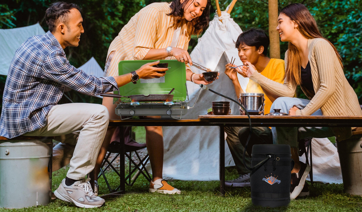 Don't go camping without this great bundle from Flame King! The Flame King GH5-RBH-5LB bundle comes with a 5LB (1.2 gallons) refillable propane tank, a propane rubber hose YSN-QCC-1LB, and a Gas Hauler - an insulated protective carrying case for 5LB tanks. The Gas Hauler is a must-have to protect your tank when transporting during boating, camping, fishing, RVing, or tailgating. Designed with maximum safety, this gas hauler comes with safety vent holes for breathing in case the pressure relief valve needs to release any propane. Gas Hauler also has enough room to carry your propane hose and other accessories. Gas hauler measures 8.5X13 inches; lightweight at 1.15 pounds (when empty); perfectly fits not only the the Flame King 5LB tanks but other other tanks within this size range as well. The molle webbing makes it easy to carry, attach accessories, and strap down for transport. The Flame King 5LB Propane Tank is a pre-purged vacuum ready for the filling of propane avoiding the cost and headache of purging your new tank. It is built from high-grade welded steel and powder-coated for rust prevention. For your safety, your tank comes with an OPD valve to prevent overfilling. It is also x-ray and hydrostatic tested. You can be sure to transport safely both in the US and CA as they are DOT and Transport Canada certified. Flame King's 4-FT propane adapter hose (YSN-QCC-1LB) connects your 1LB appliance to a 5LB propane tank using a QCC1 or Type-1 connection. The hose tethers to the CGA hook on your propane-powered appliances including camping stoves, tabletop grills, lanterns, and more.
