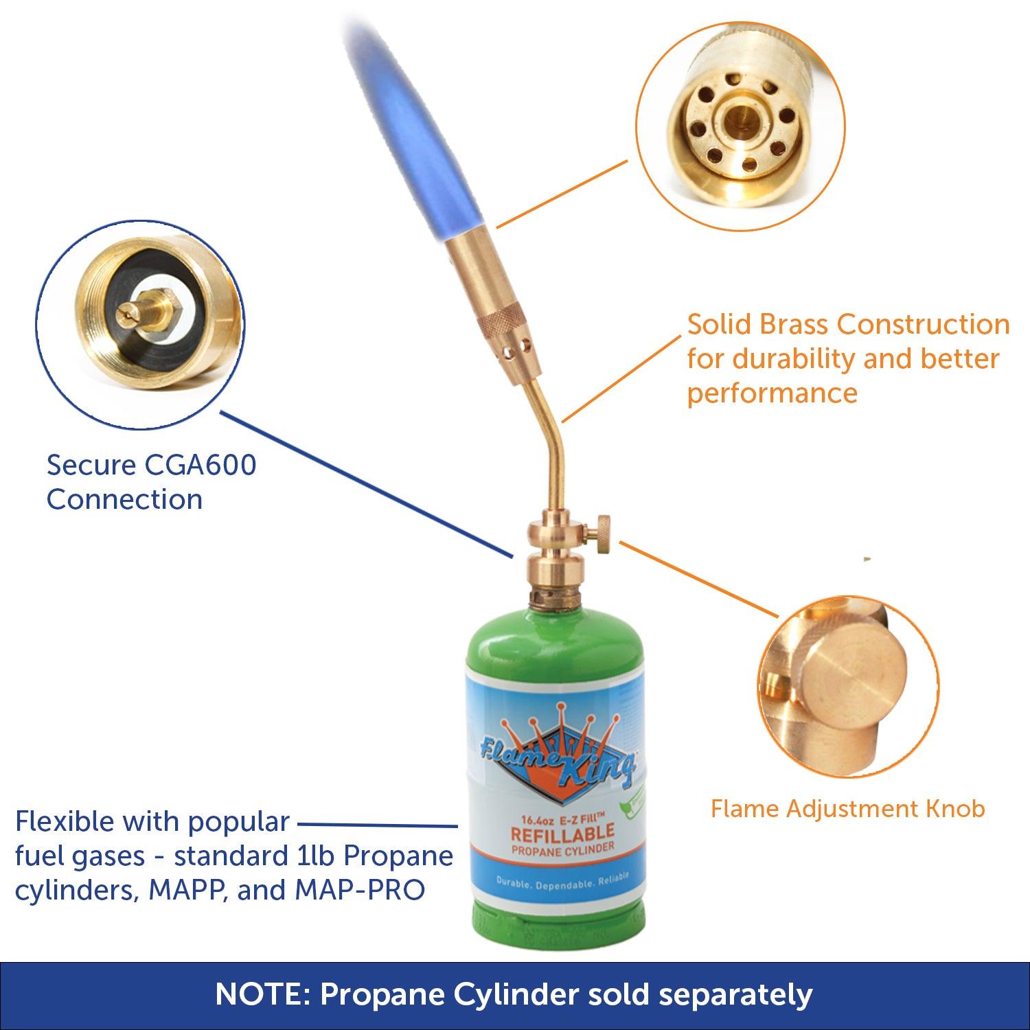 The Flame King YSNAX1-003 brass propane torch head has an enlarged combustion tip designed for a strong wider flame for Multi-Purpose use - lighting charcoal or campfire, soldering copper, thawing frozen pipes, metal bending, plumbing, and DIY craftworks. Professionally designed with optimized size for comfortable hand-torching activities. Also includes a built-in flame control valve to easily size flame and extinguish it when finished. Made in 100% solid brass for durability and rust protection. Torch is compatible with popular fuel gases and cylinder tanks with CGA600 connections - Flame King's 1/4lb and 1lb Propane Cylinders, MAPP, and MAP-PRO