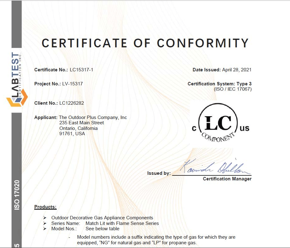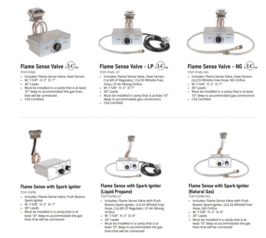 The Flame Sense System Match Lit is a valve with a sensor that will shut-off automatically when it detects the flame has gone out. Part Number: TOP-FSML
