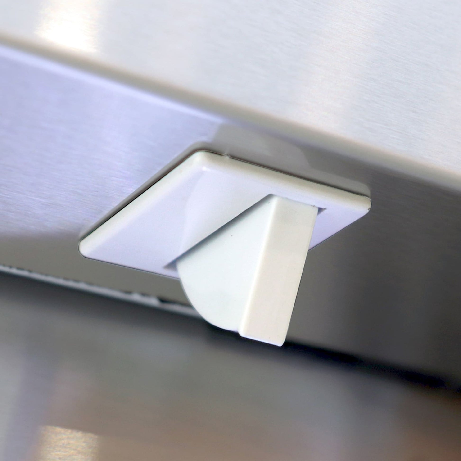 - The two solid stainless steel doors close automatically when opened at less than 90 degrees and stay open when needed for easy restocking.
