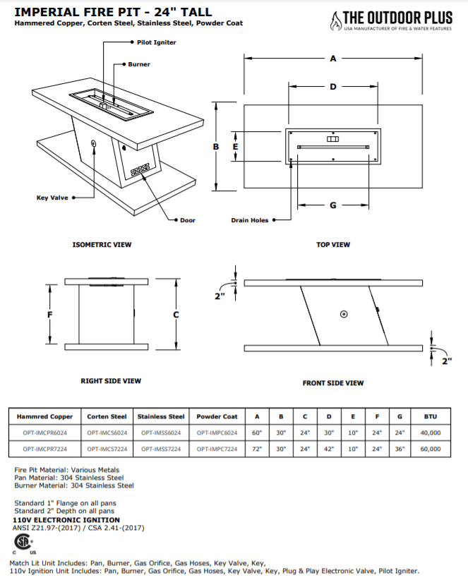 Imperial Fire Pit Table 15" Tall - Specification Sheet