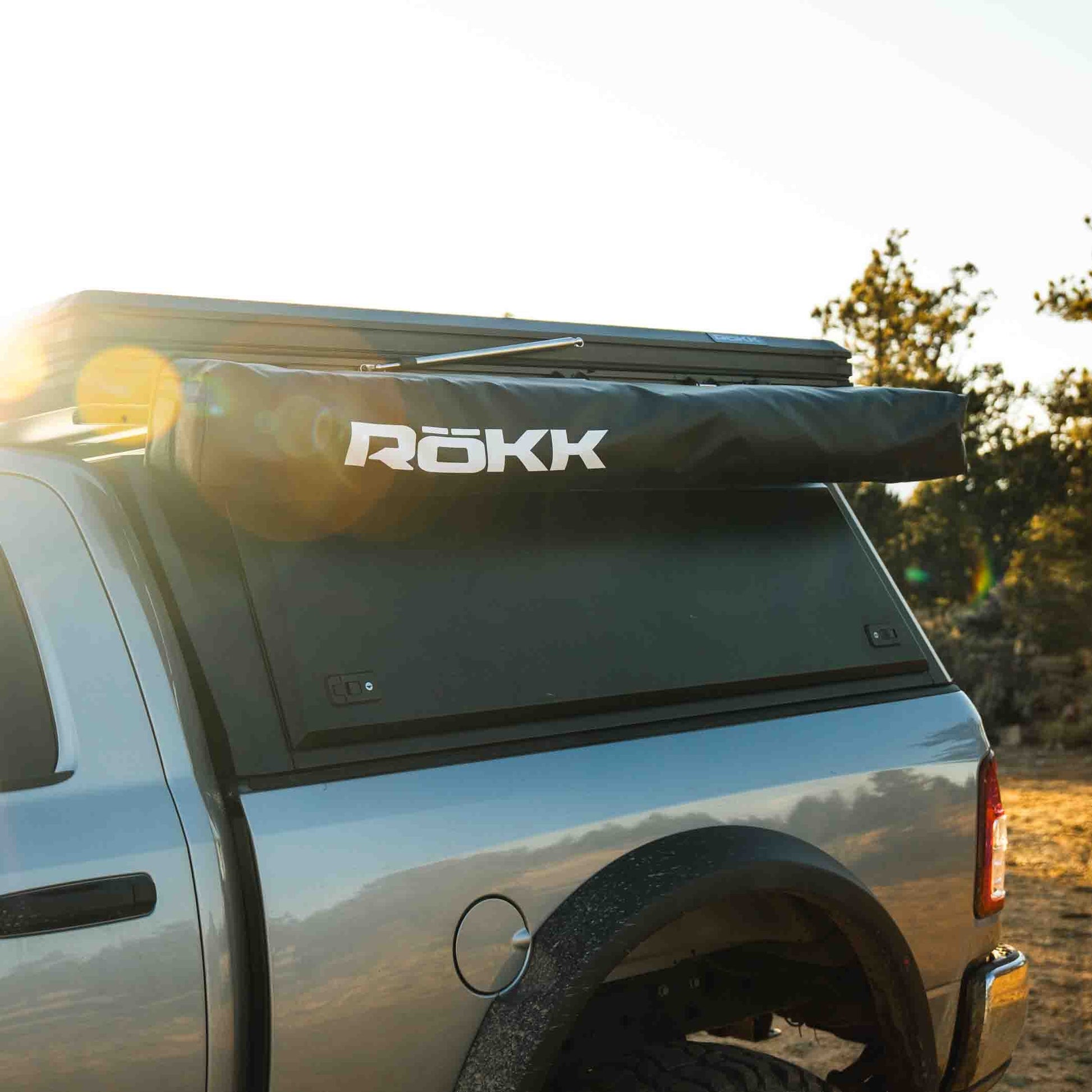Explore farther and adventure more with the ÖVRCAST 270° Awning. Engineered with 600D Oxford Fabric, this awning withstands harsh conditions, offering 18’ x 12’ of coverage and 6’ of depth. Stay protected from rain and sun with free-standing wind tolerance up to 40 mph, or deploy built-in poles for gusts beyond. Featuring 4 LED lights, it packs into an 82” x 7.5” x 7.5” bag at 61 lbs. Includes awning, stakes, ratcheting guy lines, USB light cord, wrench, L brackets, bolts, and storage bag.