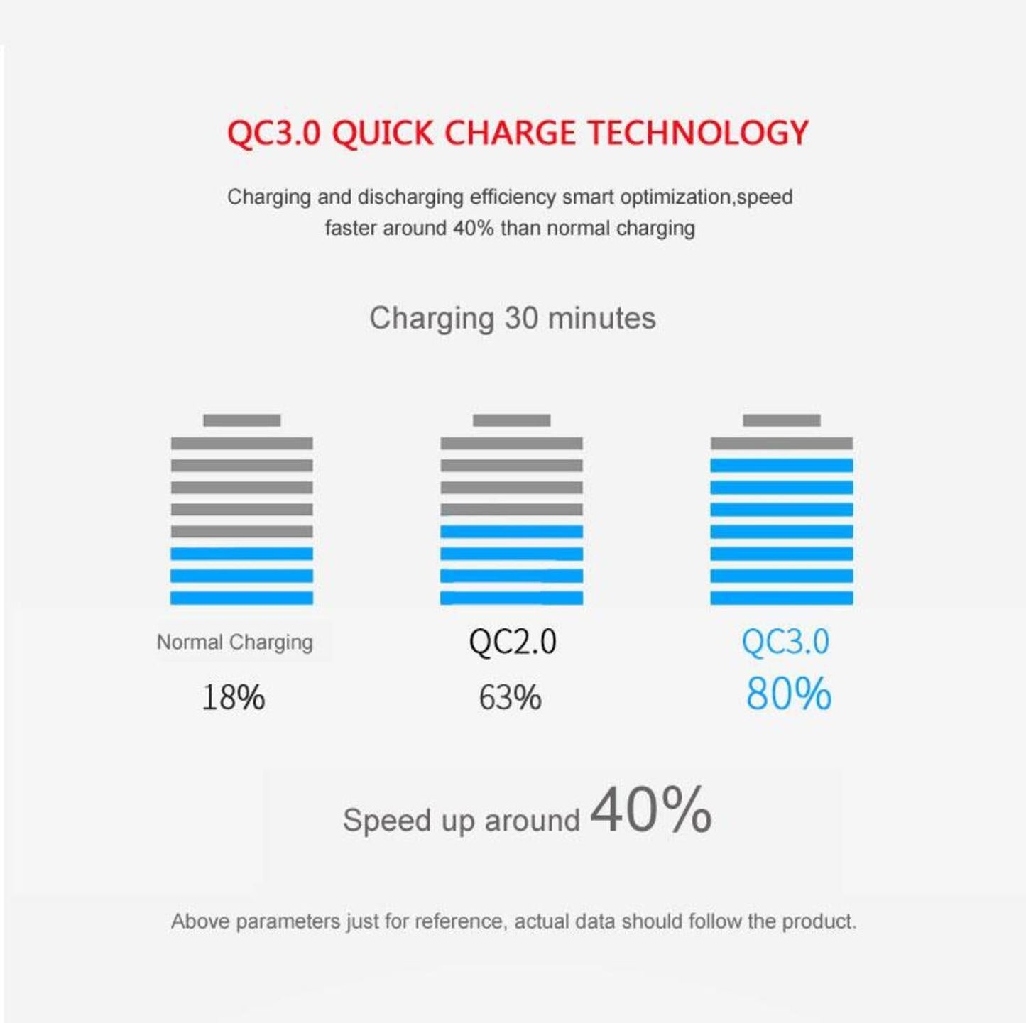 - Supports Quick Charge QC 3.0. Charge up to 80% faster than standard USB on QC3.0 enabled devices. Backward compatible with QC2.0 devices.